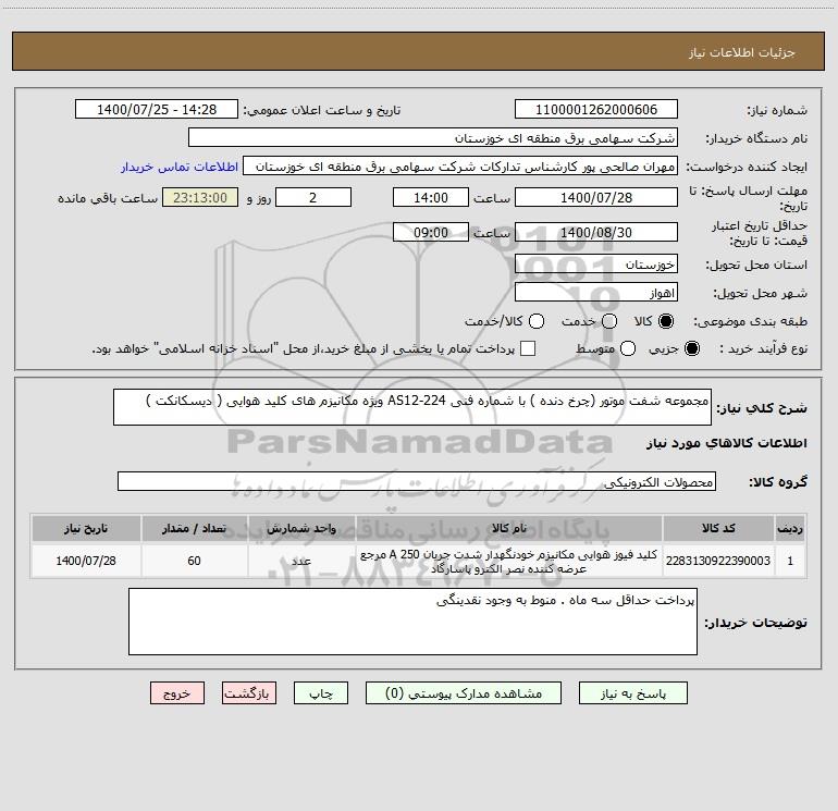 شرح کلی نیاز: مجموعه شفت موتور (چرخ دنده ) با شماره فنی AS12-224 ویژه مکانیزم های کلید هوایی ( دیسکانکت )