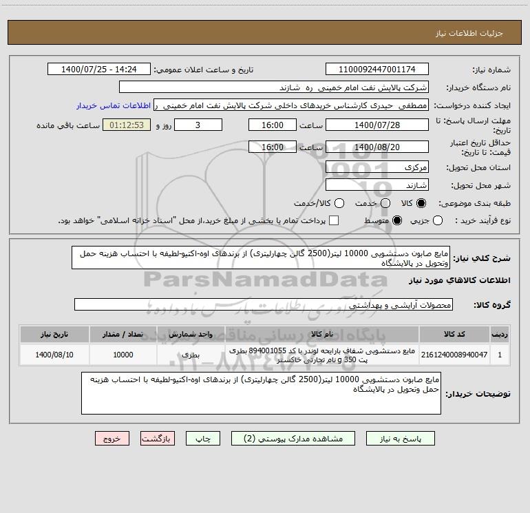 شرح کلی نیاز: مایع صابون دستشویی 10000 لیتر(2500 گالن چهارلیتری) از برندهای اوه-اکتیو-لطیفه با احتساب هزینه حمل وتحویل در پالایشگاه