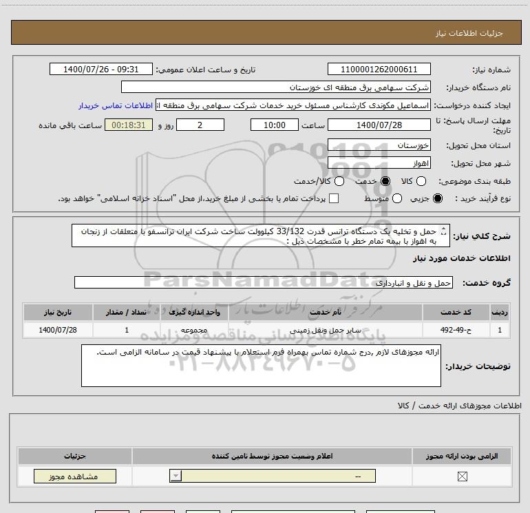 شرح کلی نیاز: حمل و تخلیه یک دستگاه ترانس قدرت 33/132 کیلوولت ساخت شرکت ایران ترانسفو با متعلقات از زنجان به اهواز با بیمه تمام خطر با مشخصات ذیل :