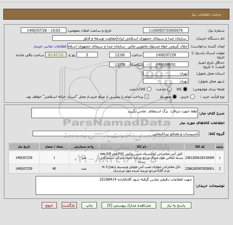 | 1 | 2281200618310009 | کابل آنتن مخابراتی کوآکسیال جنس روکش PVC قطر 0/9 mm بسته کلافی طول متری مرجع عرضه کننده شرکت سیما کابل رسانا | متر | 1 | 1400/07/29 |
