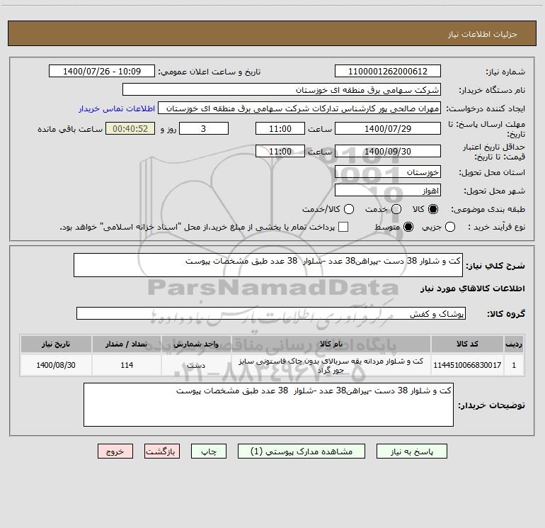شرح کلی نیاز: کت و شلوار 38 دست -پیراهن38 عدد -شلوار 38 عدد طبق مشخصات پیوست