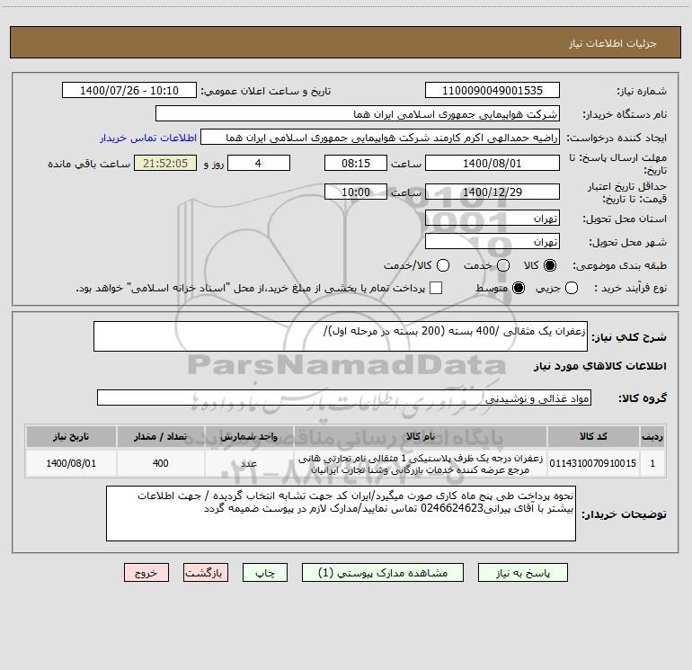 شرح کلی نیاز: زعفران یک مثقالی /400 بسته (200 بسته در مرحله اول)/