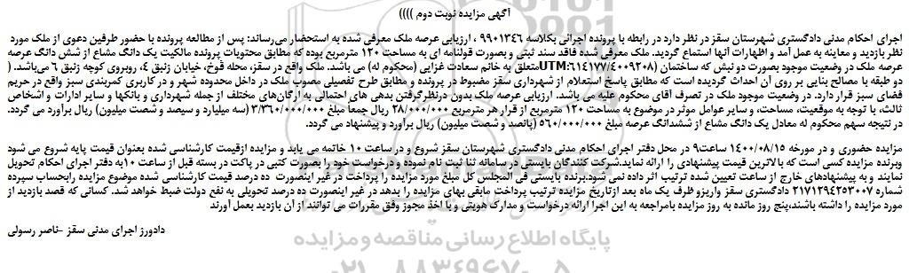 اجرای احکام مدنی دادگستری شهرستان سقز در نظر دارد در رابطه با پرونده اجرائی بکلاسه 9901346 ، ارزیابی عرصه ملک معرفی شده به استحضار میرساند: پس از مطالعه پرونده با حضور طرفین دعوی از ملک مورد نظر بازدید و معاینه به عمل آمد و اظهارات آنها استماع گردید. ملک معرفی شده فاقد سند ثبتی و بصورت قولنامه ای به مساحت 120 مترمربع بوده که مطابق محتویات پرونده مالکیت یک دانگ مشاع از شش دانگ عرصه متعلق به خانم سعادت غزایی (محکوم له) می باشد. ملک واقع در سقز، محله قَوخ، خیابان زنبق 4، روبروی کوچه زنبق 6 میباشد. (UTM:614177/4009208) عرصه ملک در وضعیت موجود بصورت دو نبش که ساختمان دو طبقه با مصالح بنایی بر روی آن احداث گردیده است که مطابق پاسخ استعلام از شهرداری سقز مضبوط در پرونده و مطابق طرح تفصیلی مصوب ملک در داخل محدوده شهر و در کاربری کمربندی سبز واقع در حریم فضای سبز قرار دارد. در وضعیت موجود ملک در تصرف آقای محکوم علیه می باشد. ارزیابی عرصه ملک بدون درنظرگرفتن بدهی های احتمالی به ارگانهای مختلف از جمله شهرداری و بانکها و سایر ادارات و اشخاص ثالث، با توجه به موقعیت، مساحت، و سایر عوامل موثر در موضوع به مساحت 120 مترمربع از قرار هر مترمربع 28/000/000 ریال جمعاً مبلغ 3/360/000/000 (سه میلیارد و سیصد و شصت میلیون) ریال برآورد می گردد. در نتیجه سهم محکوم له معادل یک دانگ مشاع از ششدانگ عرصه مبلغ 560/000/000 (پانصد و شصت میلیون) ریال برآورد و پیشنهاد می گردد.