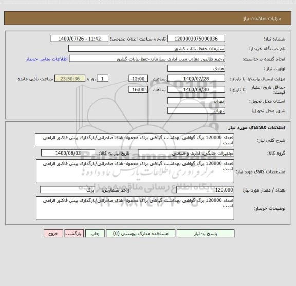شرح کلی نیاز: تعداد 120000 برگ گواهی بهداشت گیاهی برای محموله های صادراتی/بارگذاری پیش فاکتور الزامی است