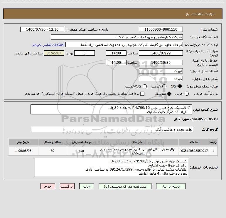 شرح کلی نیاز: لاستیک چرخ مینی بوس PN:700/16 به تعداد 30رول.