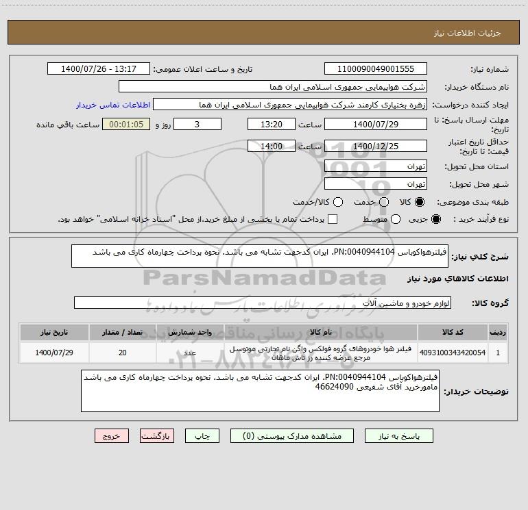 شرح کلی نیاز: فیلترهواکوباس PN:0040944104. ایران کدجهت تشابه می باشد. نحوه پرداخت چهارماه کاری می باشد