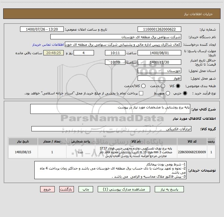 شرح کلی نیاز: پایه برج روشنایی با مشخصات مورد نیاز در پیوست