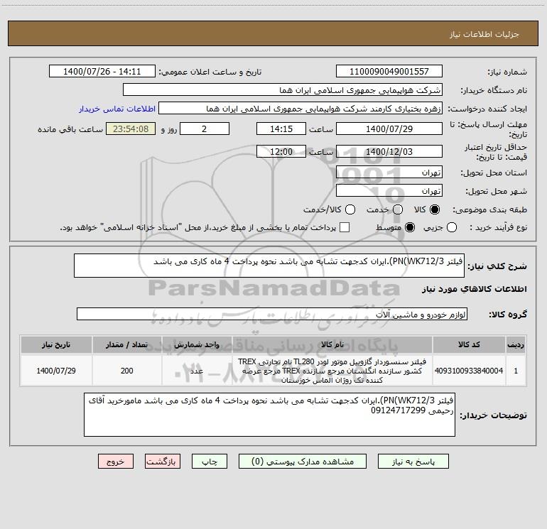 شرح کلی نیاز: فیلتر PN(WK712/3).ایران کدجهت تشابه می باشد نحوه پرداخت 4 ماه کاری می باشد