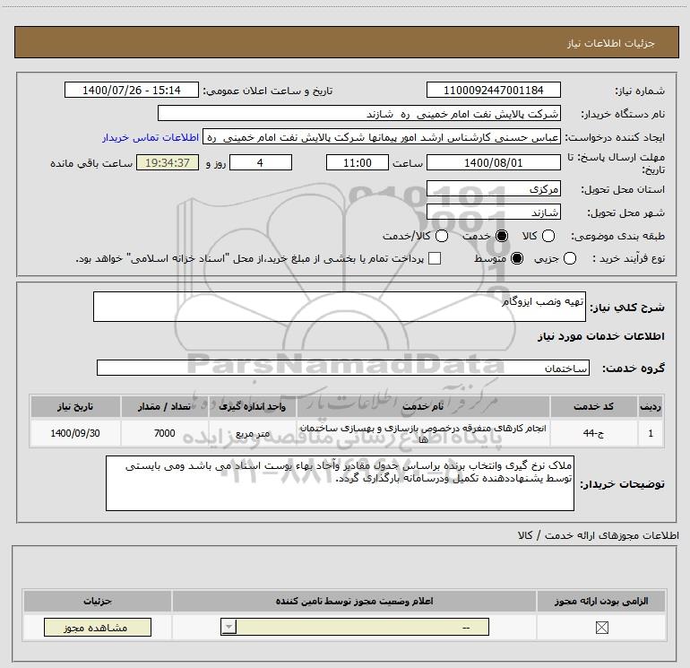 شرح کلی نیاز: تهیه ونصب ایزوگام