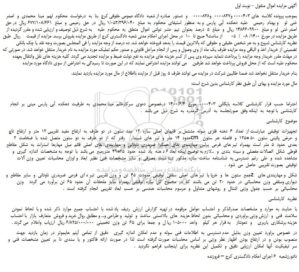 بموجب پرونده کلاسه  های 0000403 و0000837  و0000838    و  دستور  صادره از شعبه  دادگاه عمومی حقوقی کرج  بنا  به  درخواست  محکوم  لهم  مینا  محمدی  و  اصغر غنی  لو    و بهنام  رحیمی    علیه  دهکده  آبی  پارس  و به  منظور  استیفای  محکوم  به  مبلغ  1/052/396/040 ریال  در  حق  رحیمی  و  مبلغ  677/108/661 ریال  در حق  اصغر غنی  لو  و مبلغ  1486609900 ریال  و  مبلغ  5  درصد  بعنوان  نیم  عشر  دولتی  اموال  متعلق  به  محکوم  علیه    به شرح ذیل توصیف و ارزیابی شده و مقرر گردیده از طریق مزایده در مورخ 1400/ 08  /  05      از ساعت9 صبح تا  10  در محل اجرای احکام مدنی شعبه دادگستری کرج از طریق مزایده بفروش برسد. مزایده از قیمت    ریال  طبق نظریه کارشناس شروع و به هر شخص حقیقی و حقوقی که بالاترین قیمت را بدهد فروخته خواهد شد. ده درصد از وجه مزایده را فی المجلس بصورت وجه نقد یا چک بانکی تضمینی از خریدار اخذ و الباقی وجه مزایده ظرف یک ماه از وی وصول و پس از انجام مراحل قانونی و صدور حکم تملیک مورد مزایده به نام خریدار منتقل خواهد شد. در صورتی که در مهلت مقرر خریدار وجه مزایده را پرداخت ننماید سپرده وی پس از کسر هزینه های مزایده به نفع دولت ضبط و مزایده تجدید می گردد. کلیه هزینه های نقل وانتقال بعهده محکوم علیه است که از محل فروش پرداخت خواهد شد طرفین    می توانند مزایده اعتراض نمایند که در این صورت تا رسیدگی به اعتراض از سوی دادگاه مورد مزایده