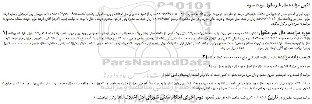 آگهی مزایده مال غیرمنقول نوبت سوم