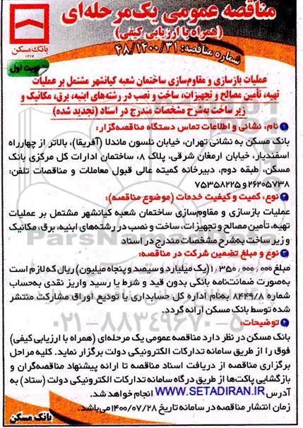 عملیات بازسازی و مقاوم سازی ساختمان شعبه کیانشهر مشتمل بر عملیات تهیه ، تامین مصالح و تجهیزات ، حمل ، ساخت و نصب در رشته های ابنیه ، برق ، مکانیک و زیرساخت واقع در اسناد (تجدید شده)