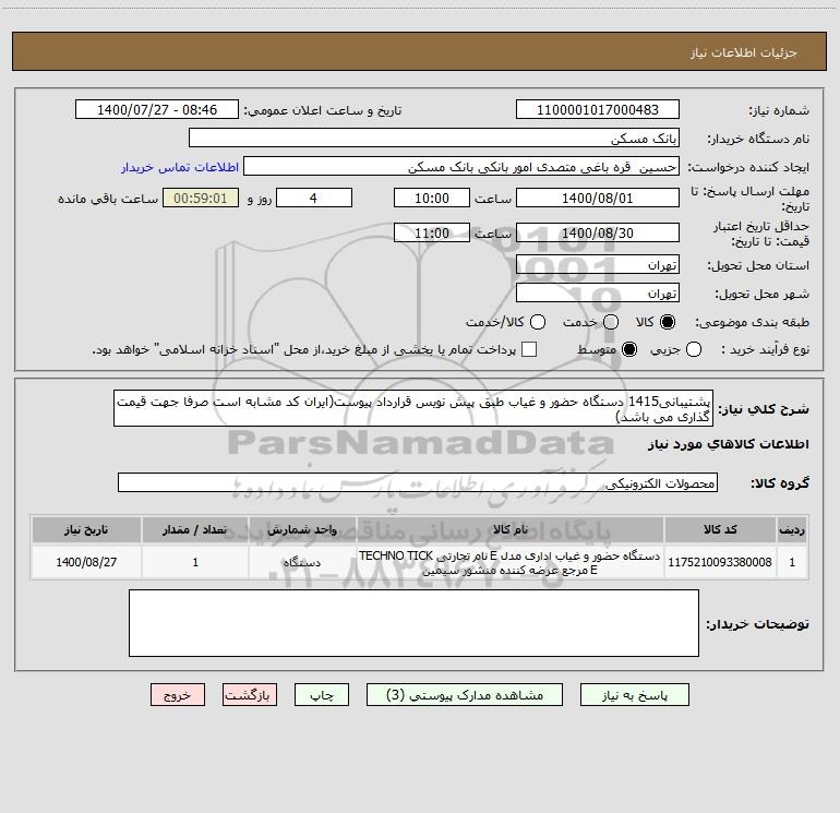 شرح کلی نیاز: پشتیبانی1415 دستگاه حضور و غیاب طبق پیش نویس قرارداد پیوست(ایران کد مشابه است صرفا جهت قیمت گذاری می باشد)