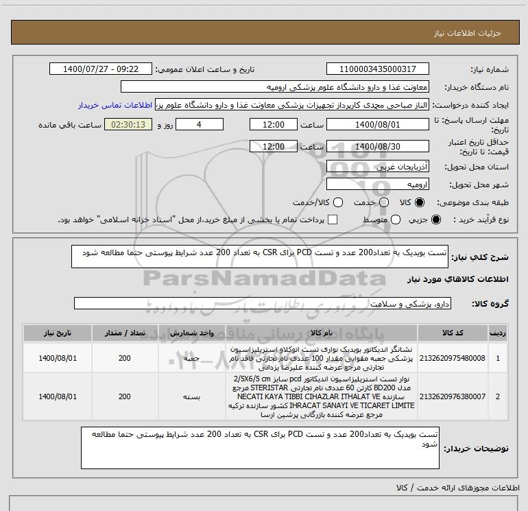 شرح کلی نیاز: تست بویدیک به تعداد200 عدد و تست PCD برای CSR به تعداد 200 عدد شرایط پیوستی حتما مطالعه شود