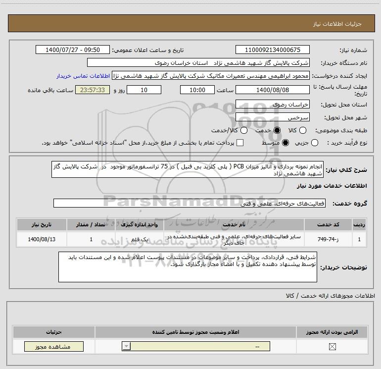 شرح کلی نیاز: انجام نمونه برداری و آنالیز میزان PCB ( پلی کلرید بی فنیل ) در 75 ترانسفورماتور موجود در شرکت پالایش گاز شهید هاشمی نژاد