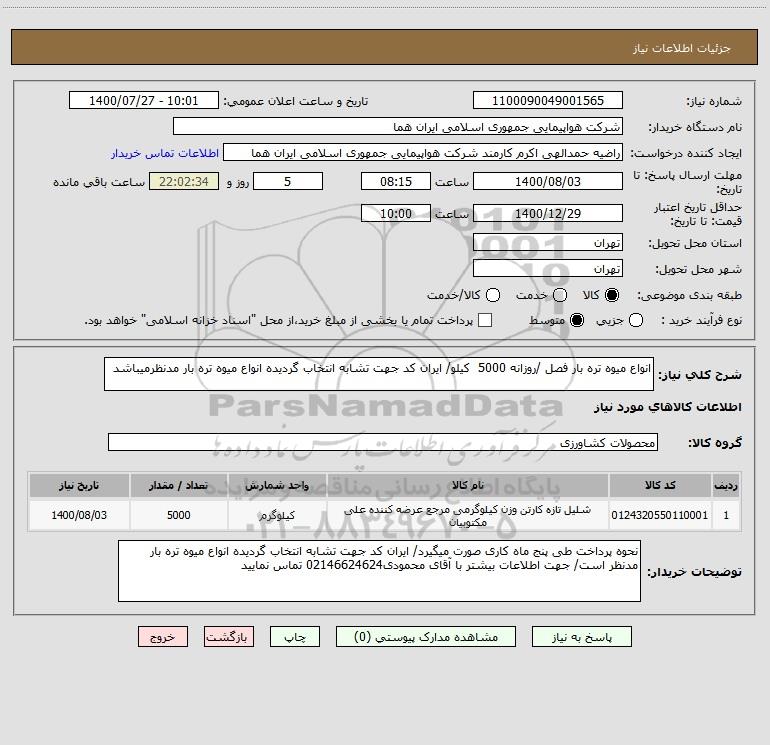 شرح کلی نیاز: انواع میوه تره بار فصل /روزانه 5000 کیلو/ ایران کد جهت تشابه انتخاب گردیده انواع میوه تره بار مدنظرمیباشد