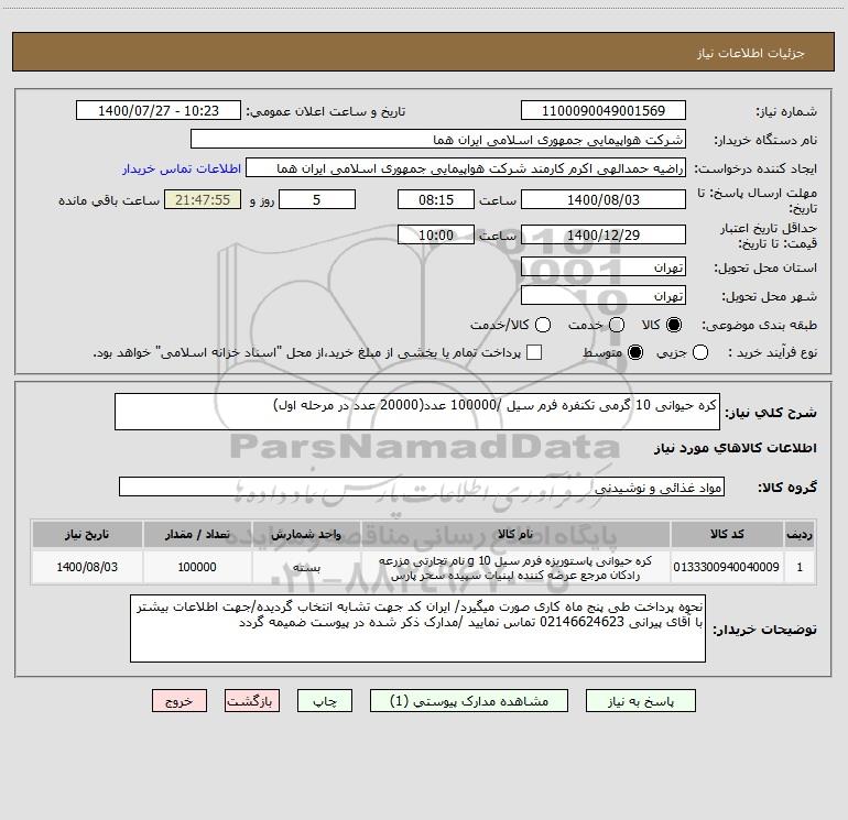 شرح کلی نیاز: کره حیوانی 10 گرمی تکنفره فرم سیل /100000 عدد(20000 عدد در مرحله اول)