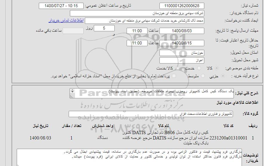 | 1 | 2231200a01310001 | کیس رایانه کامل مدل B606 نام تجارتی DATIS کشور سازنده ایران مرجع سازنده DATIS مرجع عرضه کننده بابک پاک طینت | دستگاه | 1 | 1400/08/03 |