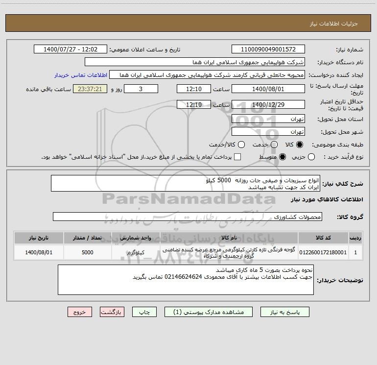 شرح کلی نیاز: انواع سبزیجات و صیفی جات روزانه 5000 کیلو