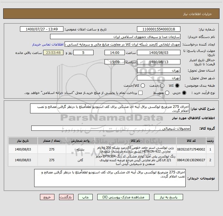 شرح کلی نیاز: اجرای 275 مترمربع اپوکسی براق آینه ای مشکی برای کف استودیو لطفاًمبلغ با درنظر گرفتن مصالح و نصب اعلام گردد.