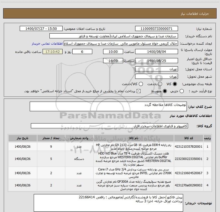 نام دستگاه خریدار: سازمان صدا و سیمای جمهوری اسلامی ایران(معاونت توسعه و فناور