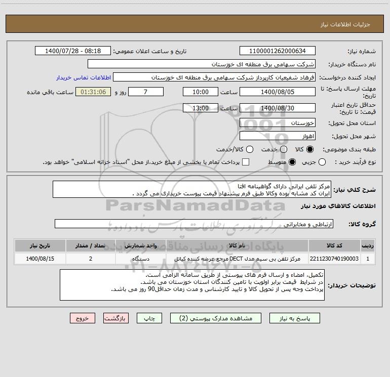 شرح کلی نیاز: مرکز تلفن ایرانی دارای گواهینامه افتا ایران کد مشابه بوده وکالا طبق فرم پیشنهاد قیمت پیوست خریداری می گردد .