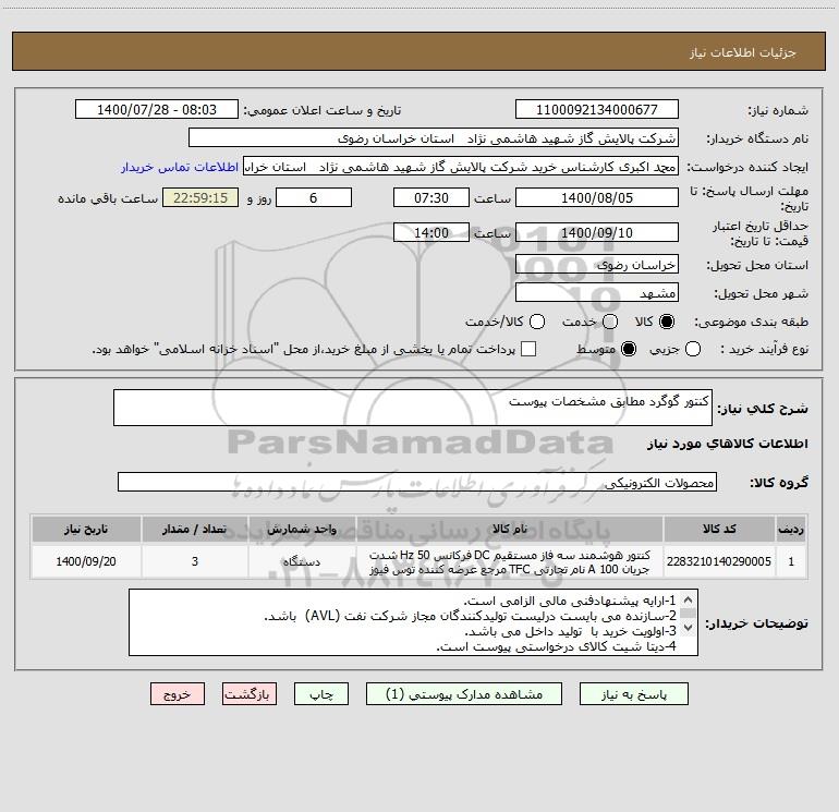 نام دستگاه خریدار:شرکت پالایش گاز شهید هاشمی نژاد استان خراسان رضوی