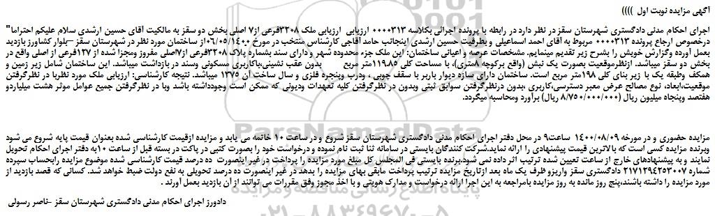 اجرای احکام مدنی دادگستری شهرستان سقز در نظر دارد در رابطه با پرونده اجرائی بکلاسه 0000313 ارزیابی  ارزیابی ملک 3208فرعی از7 اصلی بخش دو سقز به مالکیت آقای حسین ارشدی سلام علیکم احتراما" درخصوص ارجاع پرونده 0000313 مربوط به آقای احمد اسماعیلی و بطرفیت حسین ارشدی اینجانب حامد آقاجی کارشناس منتخب در مورخ 06/05/1400از ساختمان مورد نظر در شهرستان سقز –بلوار کشاورز بازدید بعمل آورده وگزارش خویش را بشرح زیر تقدیم مینمایم. مشخصات عرصه و اعیانی ساختمان: این ملک جزء محدوده شهر و دارای سند بشماره پلاک 3208فرعی از7اصلی مفروز ومجزا شده از 127فرعی از اصلی واقع در بخش دو سقز میباشد. ازنظرموقعیت بصورت یک نبش (واقع برکوچه 8متری)، با مساحت کلی 119.85متر مربع        بدون عقب نشینی،باکاربری مسکونی وسند در بازداشت میباشد. این ساختمان شامل زیر زمین و همکف وطبقه یک با زیر بنای کلی 198متر مربع است. ساختمان دارای سازه دیوار باربر با سقف چوبی ، ودرب وپنجره فلزی و سال ساخت آن 1375 میباشد. نتیجه کارشناسی: ارزیابی ملک مورد نظربا در نظرگرفتن موقعیت،ابعاد، نوع مصالح عرض معبر دسترسی،کاربری ،بدون درنظرگرفتن سوابق ثبتی وبدون در نظرگرفتن کلیه تعهدات ودیونی که ممکن است وجودداشته باشد وبا در نظرگرفتن جمیع عوامل موثر هشت میلیاردو هفتصد وپنجاه میلیون ریال (8/750/000/000 ریال) برآورد ومحاسبه میگردد.