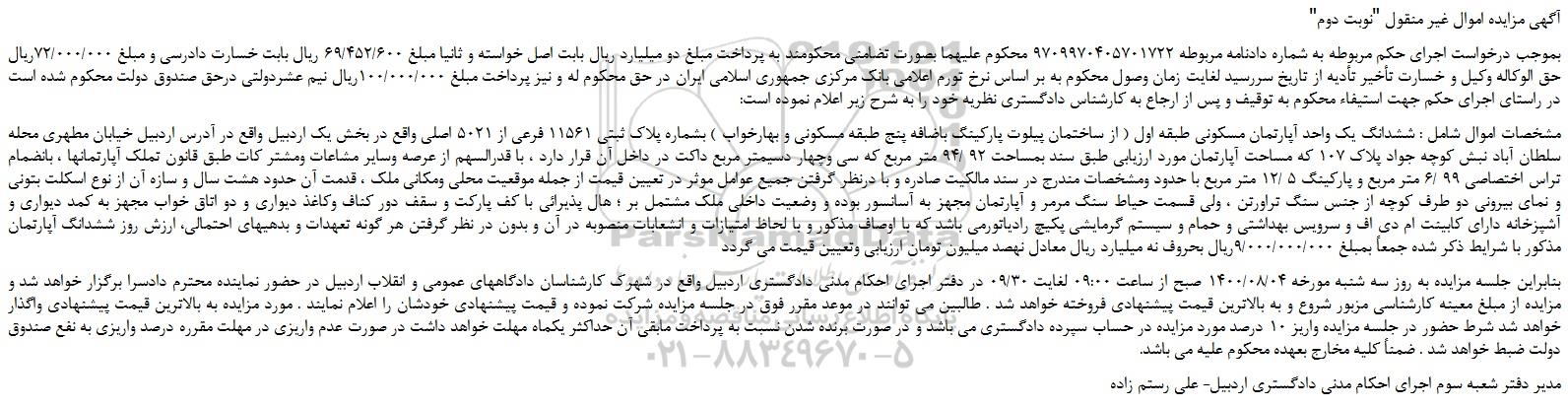بنابراین جلسه مزایده به روز سه شنبه مورخه 1400/08/04 صبح از ساعت 09:00 لغایت 09/30 در دفتر اجرای احکام مدنی دادگستری اردبیل واقع در شهرک کارشناسان دادگاههای عمومی و انقلاب اردبیل در حضور نماینده محترم دادسرا برگزار خواهد شد و مزایده از مبلغ معینه کارشناسی مزبور شروع و به بالاترین قیمت پیشنهادی فروخته خواهد شد . طالبین می توانند در موعد مقرر فوق در جلسه مزایده شرکت نموده و قیمت پیشنهادی خودشان را اعلام نمایند . مورد مزایده به بالاترین قیمت پیشنهادی واگذار خواهد شد شرط حضور در جلسه مزایده واریز 10 درصد مورد مزایده در حساب سپرده دادگستری می باشد و در صورت برنده شدن نسبت به پرداخت مابقی آن حداکثر یکماه مهلت خواهد داشت در صورت عدم واریزی در مهلت مقرره درصد واریزی به نفع صندوق دولت ضبط خواهد شد . ضمناً کلیه مخارج بعهده محکوم علیه می باشد.