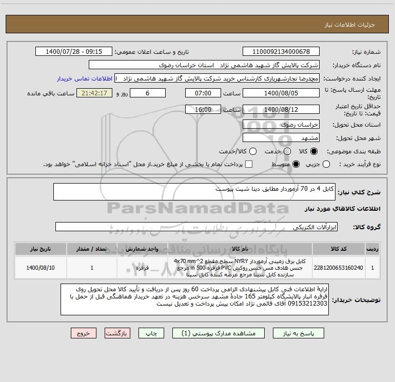 استعلام کابل 4 در 70 آرموردار مطابق دیتا شیت پیوست, استعلام کابل 4 در 70 آرموردار مطابق دیتا شیت پیوست