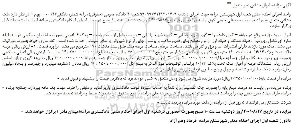 "آگهی مزایده اموال مشاعی غیر منقول "