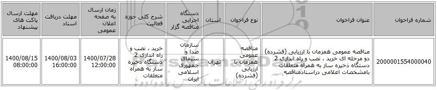 | 2000001554000040 | مناقصه عمومی همزمان با ارزیابی (فشرده) دو مرحله ای خرید ، نصب و راه اندازی 2 دستگاه ذخیره ساز به همراه متعلقات بامشخصات اعلامی دراسنادمناقصه | مناقصه عمومی همزمان با ارزیابی (فشرده) | تهران | سازمان صدا و سیمای جمهوری اسلامی ایران | خرید ، نصب و راه اندازی 2 دستگاه ذخیره ساز به همراه متعلقات | 1400/07/28 12:00:00 | 1400/08/03 16:00:00 | 1400/08/15 08:00:00 |