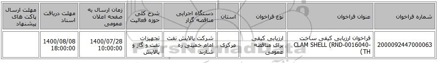 مناقصه، فراخوان ارزیابی کیفی ساخت CLAM SHELL (RND-0016040-TH) , فراخوان ارزیابی کیفی ساخت CLAM SHELL (RND-0016040-TH)