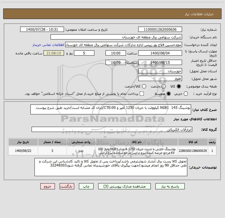 شرح کلی نیاز: بوشینگ NGB1 145 کیلوولت با جریان 1250 آمپر و CTE:00/ایران کد مشابه است/خرید طبق شرح پیوست