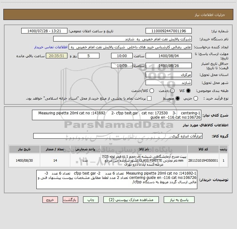 شرح کلی نیاز: 1-Measuring pipette 20ml cat no :141692 2- cfpp test gar cat no: 172530 3- centering guide en -116 cat no:106726