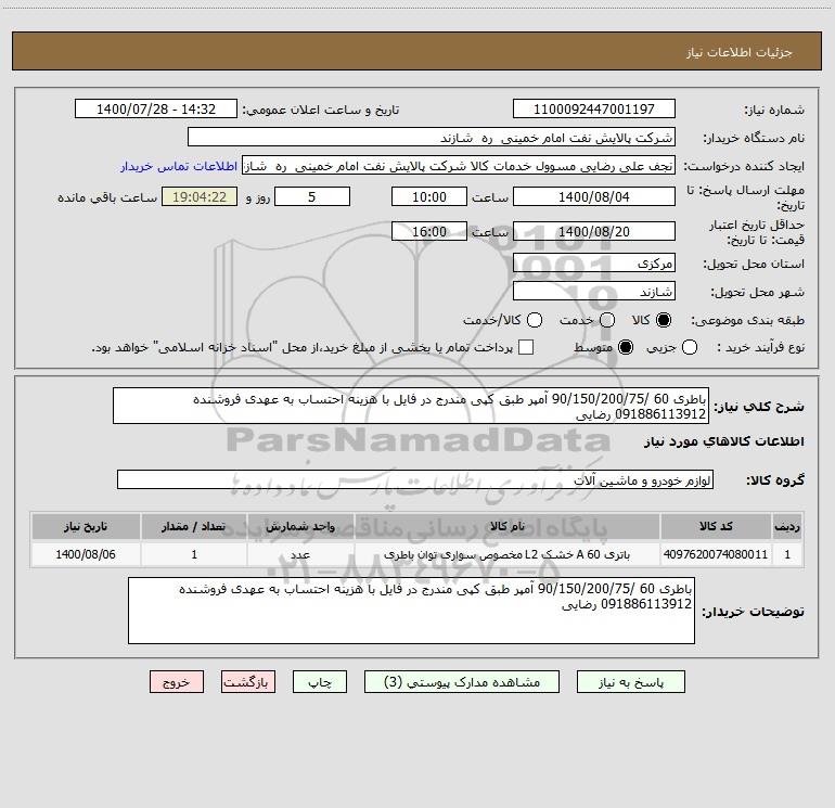 توضیحات خریدار:باطری 60 /90/150/200/75 آمپر طبق کپی مندرج در فایل با هزینه احتساب به عهدی فروشنده 091886113912 رضایی
