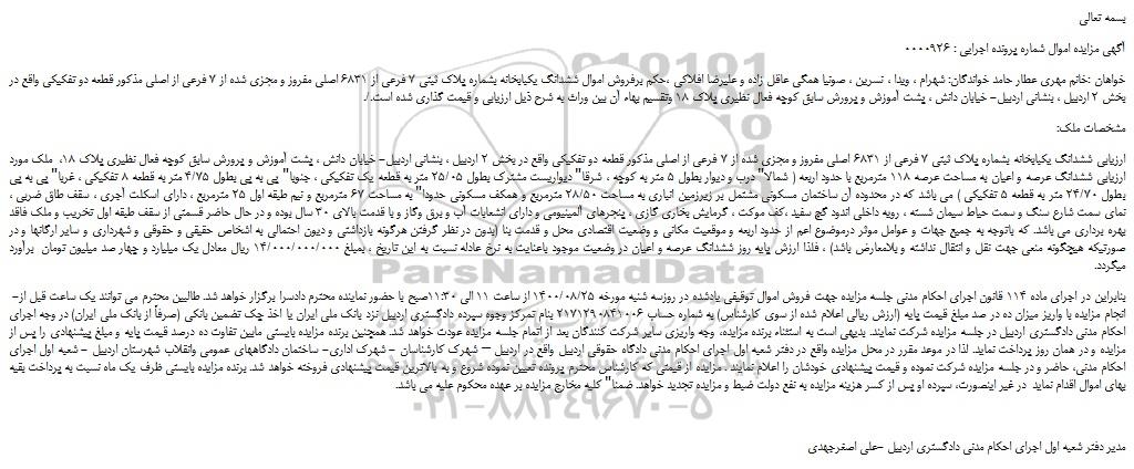 خواهان :خانم مهری عطار حامد خواندگان: شهرام ، ویدا ، نسرین ، صونیا همگی عاقل زاده و علیرضا افلاکی ،حکم برفروش اموال ششدانگ یکبابخانه بشماره پلاک ثبتی 7 فرعی از 6831 اصلی مفروز و مجزی شده از 7 فرعی از اصلی مذکور قطعه دو تفکیکی واقع در بخش 2 اردبیل ، بنشانی اردبیل- خیابان دانش ، پشت آموزش و پرورش سابق کوچه فعال نظیری پلاک 18 وتقسیم بهاء آن بین وراث به شرح ذیل ارزیابی و قیمت گذاری شده است./.