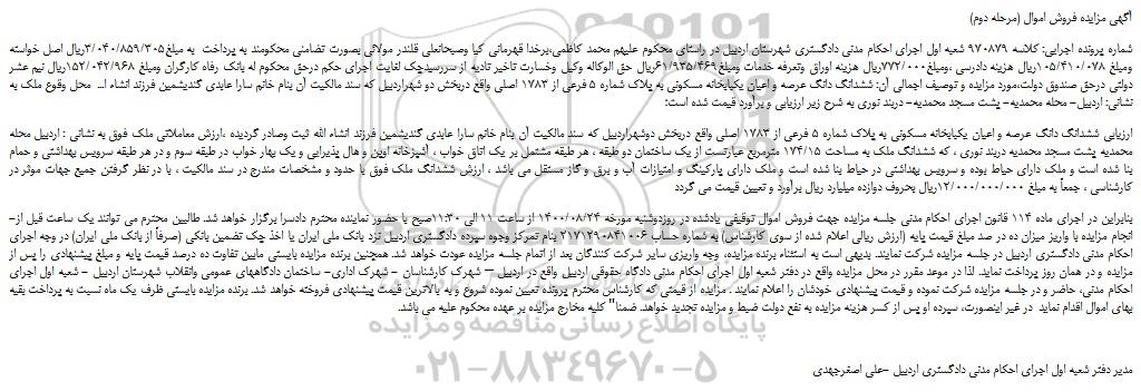 -بنابراین در اجرای ماده 114 قانون اجرای احکام مدنی جلسه مزایده جهت فروش اموال توقیفی یادشده در روزدوشنبه مورخه 1400/08/24 از ساعت 11 الی 11:30صبح با حضور نماینده محترم دادسرا برگزار خواهد شد. طالبین محترم می توانند یک ساعت قبل از انجام مزایده با واریز میزان ده در صد مبلغ قیمت پایه (ارزش ریالی اعلام شده از سوی کارشناس) به شماره حساب 2171290841006 بنام تمرکز وجوه سپرده دادگستری اردبیل نزد بانک ملی ایران یا اخذ چک تضمین بانکی (صرفاً از بانک ملی ایران) در وجه اجرای احکام مدنی دادگستری اردبیل در جلسه مزایده شرکت نمایند. بدیهی است به استثناء برنده مزایده، وجه واریزی سایر شرکت کنندگان بعد از اتمام جلسه مزایده عودت خواهد شد. همچنین برنده مزایده بایستی مابین تفاوت ده درصد قیمت پایه و مبلغ پیشنهادی را پس از مزایده و در همان روز پرداخت نماید. لذا در موعد مقرر در محل مزایده واقع در دفتر شعبه اول اجرای احکام مدنی دادگاه حقوقی اردبیل واقع در اردبیل – شهرک کارشناسان - شهرک اداری- ساختمان دادگاههای عمومی وانقلاب شهرستان اردبیل - شعبه اول اجرای احکام مدنی، حاضر و در جلسه مزایده شرکت نموده و قیمت پیشنهادی خودشان را اعلام نمایند . مزایده از قیمتی که کارشناس محترم پرونده تعیین نموده شروع و به بالاترین قیمت پیشنهادی فروخته خواهد شد. برنده مزایده بایستی ظرف یک ماه نسبت به پرداخت بقیه بهای اموال اقدام نماید  در غیر اینصورت، سپرده او پس از کسر هزینه مزایده به نفع دولت ضبط و مزایده تجدید خواهد. ضمنا" کلیه مخارج مزایده بر عهده محکوم علیه می باشد.