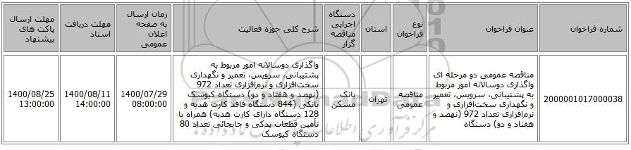 2000001017000038 | مناقصه عمومی دو مرحله ای واگذاری دوسالانه امور مربوط به پشتیبانی، سرویس، تعمیر و نگهداری سختافزاری و نرمافزاری تعداد 972 (نهصد و هفتاد و دو) دستگاه | مناقصه عمومی | تهران | بانک مسکن | واگذاری دوسالانه امور مربوط به پشتیبانی، سرویس، تعمیر و نگهداری سختافزاری و نرمافزاری تعداد 972 (نهصد و هفتاد و دو) دستگاه کیوسک بانکی (844 دستگاه فاقد کارت هدیه و 128 دستگاه دارای کارت هدیه) همراه با تأمین قطعات یدکی و جابجائی تعداد 80 دستگاه کیوسک | 1400/07/29 08:00:00 | 1400/08/11 14:00:00 | 1400/08/25 13:00:00 |