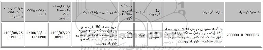 2000001017000037 | مناقصه عمومی دو مرحله ای خرید تعداد 150 (یکصد و پنجاه)دستگاه رایانه همراه طبق مشخصات فنی و شرح مندرج در اسناد مناقصه و قرارداد پیوست | مناقصه عمومی | تهران | بانک مسکن | خرید تعداد 150 (یکصد و پنجاه)دستگاه رایانه همراه طبق مشخصات فنی و شرح مندرج در اسناد مناقصه و قرارداد پیوست | 1400/07/29 08:00:00 | 1400/08/11 14:00:00 | 1400/08/25 13:00:00 |