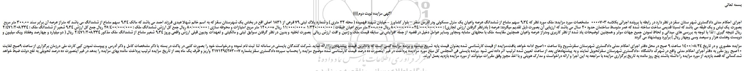 اجرای احکام مدنی دادگستری شهر ستان سقز در نظر دارد در رابطه با پرونده اجرائی بکلاسه 0000703 مشخصات مورد مزایده: ملک مورد نظر که 9.34 سهم مشاع از ششدانگ عرصه واعیان یک منزل مسکونی ودر آدرس سقز – بلوار کشاورز - خیابان شهید فهمیده ( محله 32 متری ) و شماره پلاک ثبتی 79 فرعی از 1831 اصلی اقع در بخش یک شهرستان سقز که به اسم خانم شهلا عبدی فرزند احمد می باشد که مالک 9.34 سهم مشاع از ششدانگ می باشد که متراژ عرصه آن برابر سند 300.00 متر مربع بصورت یک نبش و یک طبقه می باشد که نسبتا قدیمی ساخت ساخته شده که عمر متوسط ساختمان حدود 20 سال می باشد که ارزیابی آن بصورت ذیل تقدیم میگردد: عرصه ( بادرنظر گرفتن ارزش تجاری) : 24/000/000/000= 80/000/000 ریال *300.00 متر مربع اعیان طبقات : 1/320/000/000 = 11/000/000 ریال *120.00 متر مربع امتیازات و محوطه سازی : 80/000/000 ریال جمع کل ارزش ششدانگ ملک : 25/400/000/000 ریال جمع کل ارزش 9.34 شعیر از ششدانگ ملک : 2/471/208/334 ریال نتیجه گیری : لذا با توجه به بررسی های میدانی و لحاظ نمودن جمیع جهات موثر و همچنین توضیحات یاد شده از نظر کاربری ومتراژ عرصه واعیان همچنین مقایسه ملک با محلهای مشابه ومجاور وسایر عوامل دخیل در قضیه از جمله افزایش بی سابقه قیمت ملک و زمین و افت ارزش ریالی بصورت تخلیه و بدون در نظر گرفتن سوابق ثبتی و مالکیتی و تعهدات ودیون قبلی ارزش واقعی وروز 9.34 شعیر مشاع از ششدانگ ملک مذکور 2/471/208/334 ریال ( دو میلیارد و چهارصد وهفتاد ویک میلیون و دویست وهشت هزار و سیصد وسی وچهار ریال ) برآورد وپیشنهاد می گردد