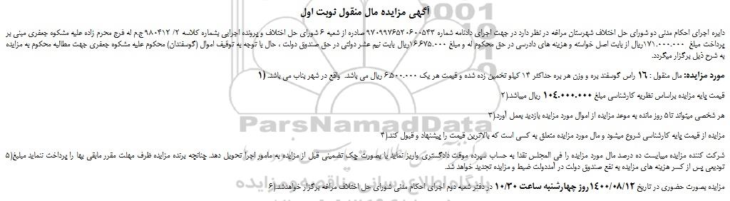 دایره اجرای احکام مدنی دو شورای حل اختلاف شهرستان مراغه در نظر دارد در جهت اجرای دادنامه شماره 9709976520600543 صادره از شعبه 6 شورای حل اختلاف و پرونده اجرایی بشماره کلاسه 2/ 980412 ج.م له فرج محرم زاده علیه مشکوه جعفری مبنی بر پرداخت مبلغ 171.000.000ریال از بابت اصل خواسته و هزینه های دادرسی در حق محکوم له و مبلغ 16.675.000ریال بابت نیم عشر دولتی در حق صندوق دولت ، حال با توجه به توقیف اموال (گوسفندان) محکوم علیه مشکوه جعفری جهت مطالبه محکوم به مزایده به شرح ذیل برگزار میگردد.
