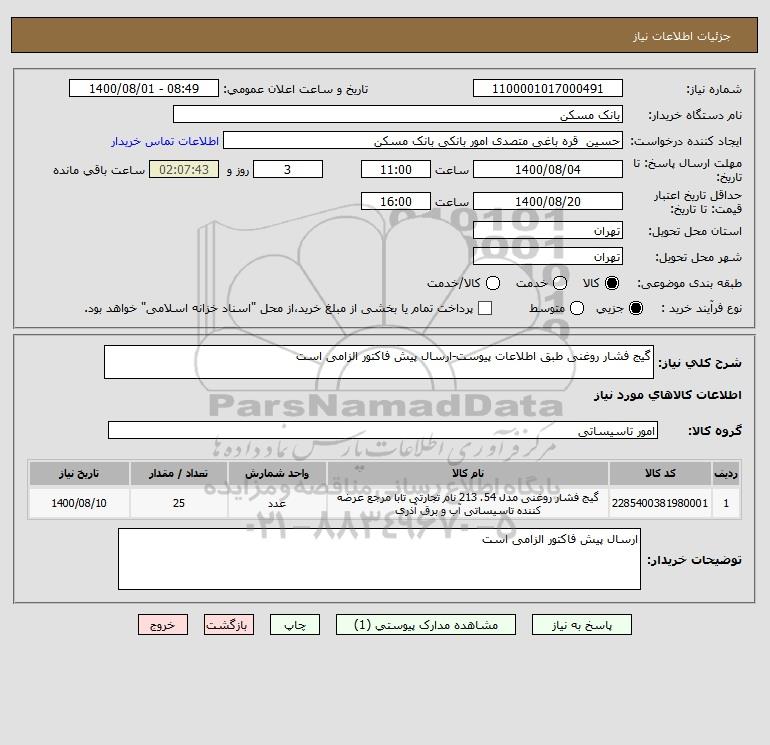 شرح کلی نیاز: گیج فشار روغنی طبق اطلاعات پیوست-ارسال پیش فاکتور الزامی است