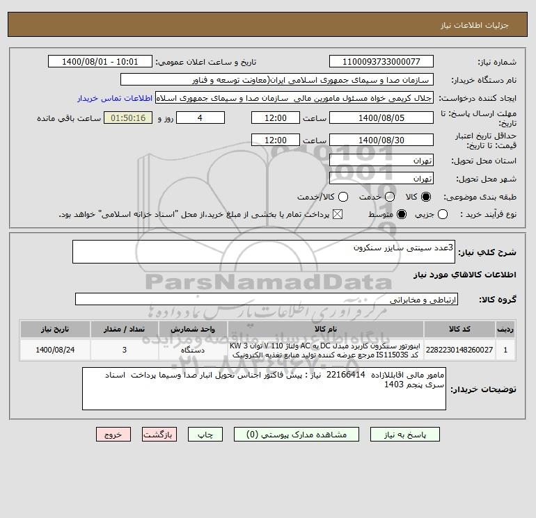 | 1 | 2282230148260027 | اینورتور سنکرون کاربرد مبدل DC به AC ولتاژ 110 V توان 3 KW کد IS11503S مرجع عرضه کننده تولید منابع تغذیه الکترونیک | دستگاه | 3 | 1400/08/24 |