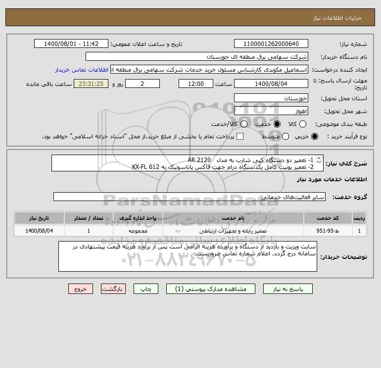 شرح کلی نیاز: 1- تعمیر دو دستگاه کپی شارب به مدل AR 2120