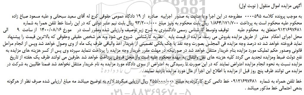 به موجب پرونده کلاسه 0000595 مطروحه در این اجرا و با عنایت به صدور اجراییه صادره از 19 دادگاه عمومی حقوقی کرج له آقای سعید سبحانی و علیه مسعود صباغ زاده محکوم علیه محکوم است به پرداخت 1/864/171/700 ریال بابت محکوم به ونیز مبلغ 93/200/000 ریال بابت نیم عشر دولتی که در این راستا خط تلفن همرا به شماره 09121697681متعلق به محکوم علیه توقیف وتوسط کارشناس رسمی دادگستری به شرح زیر توصیف وارزیابی شده ومقرر است در مورخ 1400/08/16 از ساعت 9 الی 10 در محل اجرای احکام مدنی از طریق مزایده بفروش می رسد، مزایده از قیمت پایه نظریه کارشناسی شروع می شود وبه هر شخص حقیقی وحقوقی که بالاترین قیمت را پیشنهاد نماید فروخته خواهد شد ده درصد وجه مزایده فی المجلس بصورت وجه نقد یا چک بانکی تضمینی از خریدار اخذ والباقی ظرف یک ماه از وی وصول خواهد شد وپس از انجام مراحل قانونی وصدور حکم تملیک مورد مزایده بنام خریدار منتقل خواهد شد در صورتیکه در مهلت مقرر خریدار وجه مزایده را پرداخت ننماید سپرده وی پس از کسر هزینه های مزایده به نفع دولت ضبط ومزایده تجدید می گردد کلیه هزینه های نقل وانتقال به عهده محکوم علیه است واز محل فروش پرداخت خواهد شد .طرفین می توانند ظرف یک هفته از تاریخ مزایده نسبت به نحوه انجام مزایده اعتراض نمایند که در این صورت تا رسیدگی به اعتراض از سوی دادگاه مورد مزایده به نام خریدار منتقل نخواهد شد ضمنا طالبین به شرکت در مزایده می توانند ظرف پنج روز قبل از مزایده با اطلاع این اجرا از مال مورد مزایده بازدید نمایند .