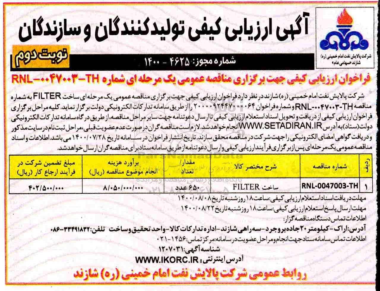 ارزیابی کیفی ساخت FILTER - نوبت دوم از کلیه افراد متخصص و شرکتها واجد شرایط دعوت به عمل میآید در مناقصه با کد خبرگزاری پارس نماد: 3879316 شرکت نمایند.