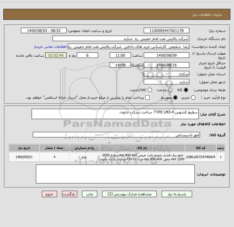 شرح کلی نیاز: سوئیچ کشویی TYPE LM3-4 ساخت شرکت جابون.