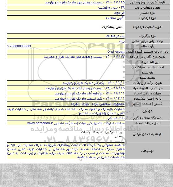 مناقصه عمومی یک مرحله ای خدمات پیمانکاری مربوط به اجرای عملیات بازسازی و مقاوم سازی ساختمان شعبه کیانشهر مشتمل بر عملیات تهیه، تامین مصالح وتجهیزات، ساخت و نصب در رشته¬های ابنیه، برق، مکانیک و زیرساخت به شرح مشخصات مندرج در اسناد مناقصه