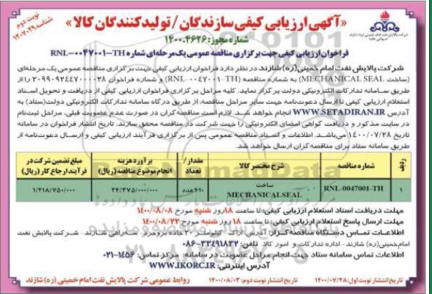 شرکت پالایش نفت امام خمینی (ره) در نظر دارد فراخوان ارزیابی کیفی جهت برگزاری مناقصه عمومی یک مرحله ای ساخت MECHANICAL SEAL ) به شماره مناقصه ( RNL-0047001 -TH ) و شماره فراخوان 2000092447000028 را از طریق سامانه تدارکات الکترونیکی دولت برگزار نماید. کلیه مراحل برگزاری فراخوان ارزیابی کیفی از دریافت و تحویل اسناد استعلام ارزیابی کیفی تا ارسال دعوتنامه جهت سایر مراحل مناقصه از طریق درگاه سامانه تدارکات الکترونیکی دولت ستاد ایران انجام خواهد شد. لازم است مناقصه گران در صورت عدم عضویت قبلی مراحل ثبت نام در سایت مذکور و دریافت گواهی امضای الکترونیکی را جهت شرکت در مناقصه محقق سازند. تاریخ انتشار فراخوان در سامانه تاریخ 1400.7.28 می باشد. اطلاعات و اسناد مناقصه عمومی پس از برگزاری فرآیند ارزیابی کیفی و ارسال دعوتنامه از طریق سامانه ستاد به مناقصه گران ارسال خواهد شد.